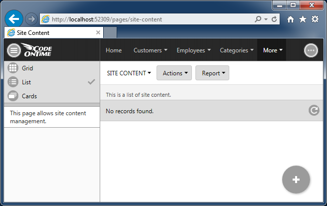 Every application created with Code On Time is composed of data and content pages. Application framework user interface Touch UI uses a combination of jQuery Mobile and Bootstrap when rendering pages in mobile and desktop browsers. Every page is a Single Page Application.