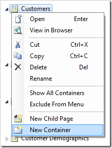 Start the Project Designer. In the Project Explorer, right-click on Customers page node and press New Container.