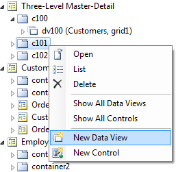 Let’s add a data view in each container. Right-click on Three-Level Master-Detail / c100 container node, and select New Data View option.