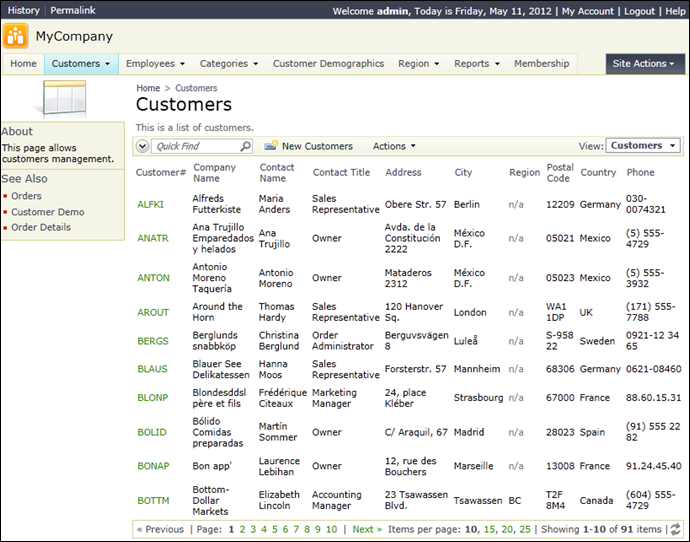 Table of Contents Pages / LayoutPrint|Previous|Next Simple The simple layout only displays a single data view on each page, with no master-detail relationships. The Customers page from a Northwind web application using Simple layout is displayed below. Continue to Pages / Layout / Tabbed