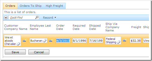 Switch to the High Freight tab. Edit the first record, and change the Order Date.