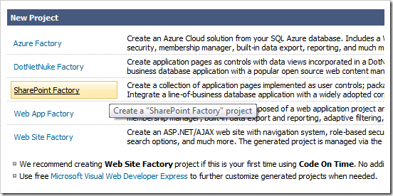 Start Code On Time and select SharePoint Factory in the list of available project types.