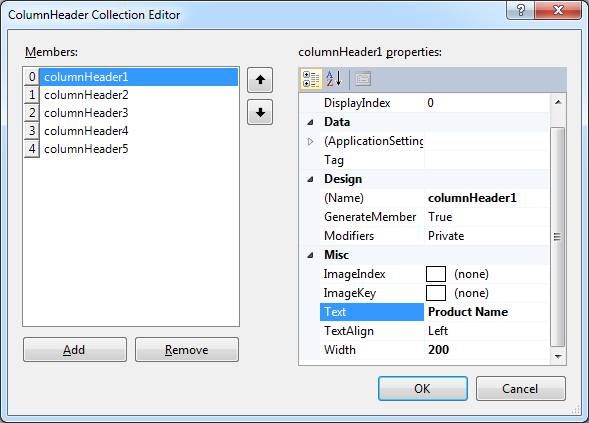 Use Properties Window to modify the Columns collection of listView1. Create five columns Product Name, Supplier Company Name, Category Name, Quantity per Unit, and Unit Price to capture a few properties of products.