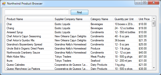 Press F5 to start the Northwind Product Browser for Windows. Click the Find button.