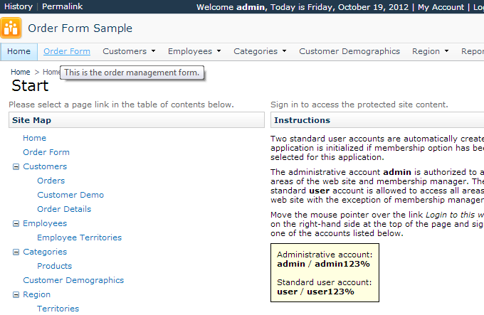 Wait for the web application to be generated, and it will open in your default browser. Log in, and you will see Order Form page on the menu bar and the site map.