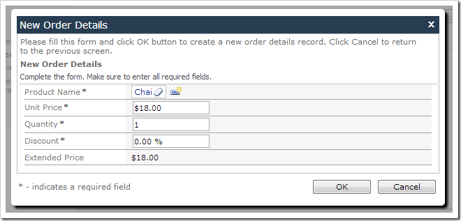 Navigate to the Order Form page, and select an order. Create a new order detail, and select a product. The Extended Price will be calculated using the default values.