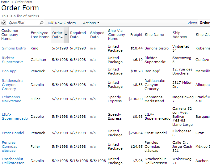 Now that the Order Form page has been set up, we will want to customize several settings. First, we shall optimize the Orders controller. The list of order is currently displayed in alphabetical order of Customer Company Name. It would make more sense to sort the orders according to the date the order was made.