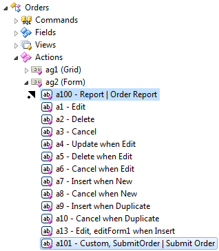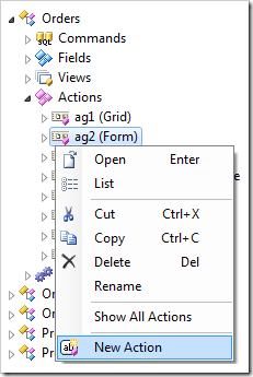 Right-click on Orders / Actions / ag2 (Form) node, and press New Action.
