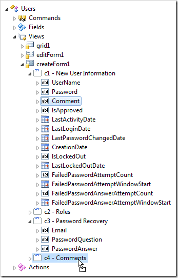 Save the category. Drag the data field Comment onto Users / Views / createForm1 / c4 – Comments category node.