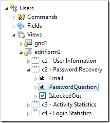 Press OK to save. Expand Users / Views / editForm1 / c1 – User Information category node. While holding Ctrl key, select the following data fields: Email, Password Question, and IsLockedOut. Drop the data fields onto Users / Views / editForm1 / c2 – Password Recovery node.