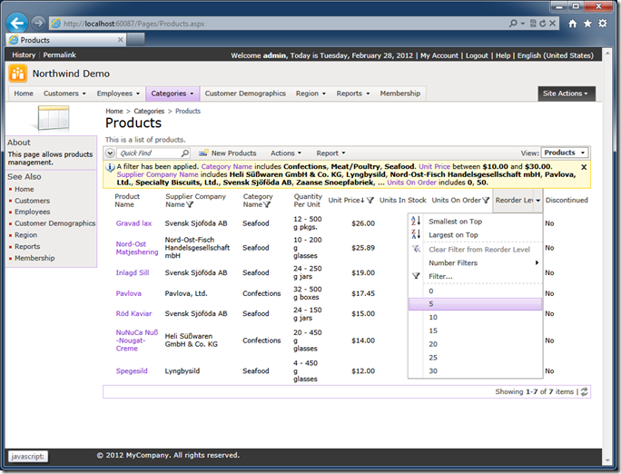 Web applications created with Code On Time offer impressive built-in filtering capabilities available to the end user. Just a few mouse clicks and a list of products is custom tailored to match complex filtering requirements.