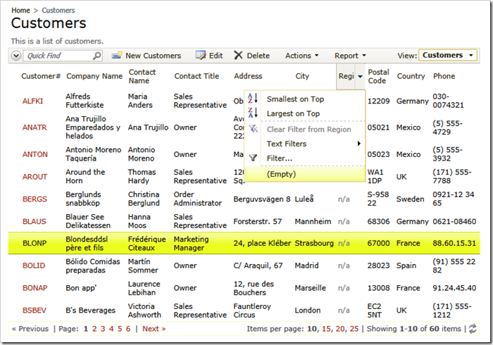 Next screen shot shows the effect of the permission property of the AccessControl attribute, which “hides” the rows with the empty Region from the end user.