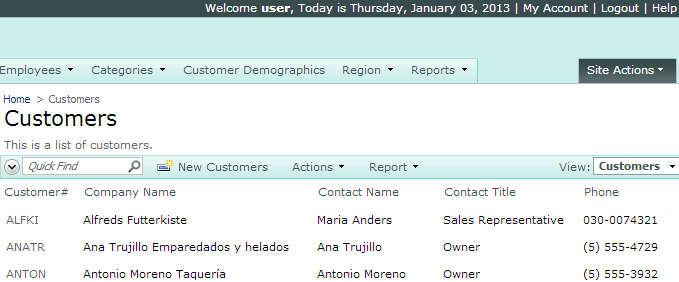 Log in with the standard user account (user / user123%) and navigate to the Customers page. Note that none of the address fields are displayed in the grid.