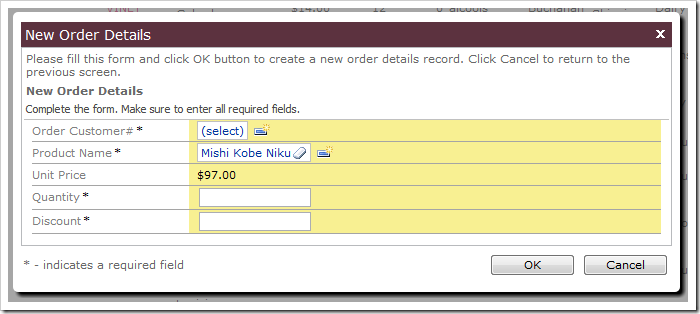 Navigate to the Order Details page, and create a new record. Select a product, and you will notice that the Unit Price has been marked up by 15%.