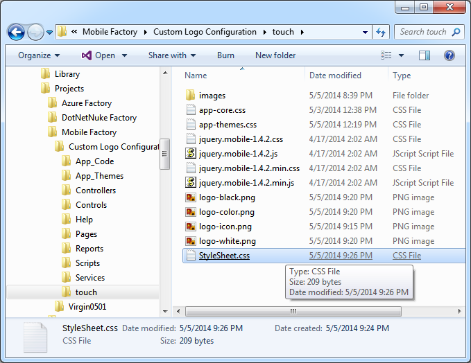 Custom file StyleSheet.css is placed in the touch folder of a Mobile Factory app in this screen shot.
