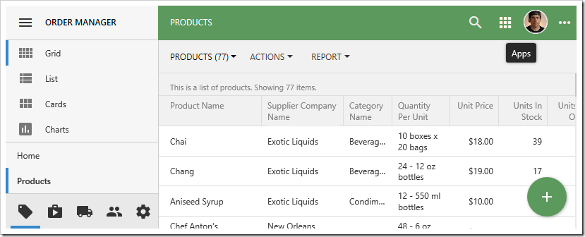The menu offers the user access to the pages in your application. The default location of the menu is in the toolbar at the top of the screen. Top level pages will be displayed as tabs in the toolbar. Nested pages can be accessed by pressing on the parent tab. Page icons will be displayed in the dropdown menu. The Quick Launch area of the sidebar will display up to five page icons, if any have been defined. The user can view a full list of pages by pressing the “Apps” icon (three by three grid of dots).