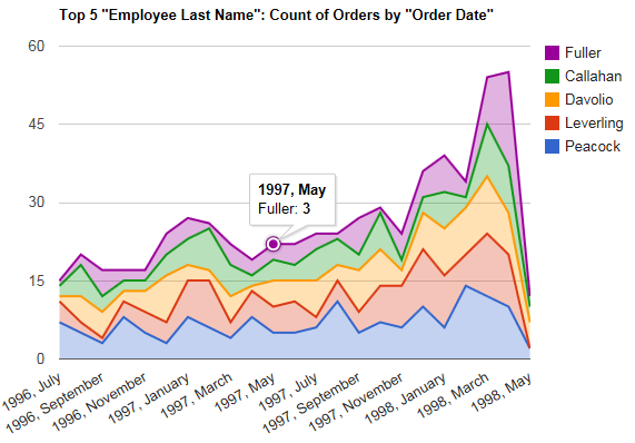 Column fields can be sorted with the same keywords. For example, the chart below shows the top 5 employees making orders over the Order Date. It appears “Peacock” made the most orders in this time period.