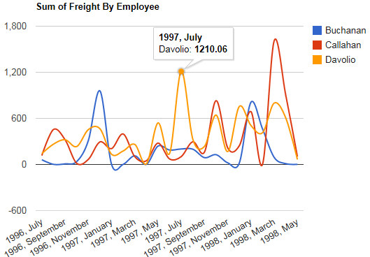 Every chart that has been automatically or manually defined will display a title. This title will be composed using the row, column, and value fields and their properties that have been specified for the chart. For example, suppose we create a curved line chart on Orders page of the Northwind sample app that uses OrderDate for rows, EmployeeID for columns, and the sum of Freight for values.