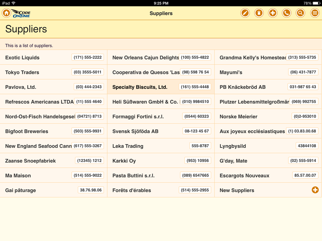The same supplier list shows first five fields defined in grid1 when displayed on iPad Air. Field names and values of a selected supplier record are displayed in the summary on the sidebar.