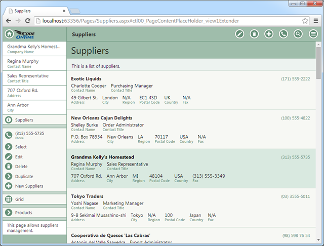 Here is the same grid view Suppliers / Views / grid1 that was configured in the previous steps. This screen shot shows Google Chrome browser with a responsive “Grid” presentation style of data.
