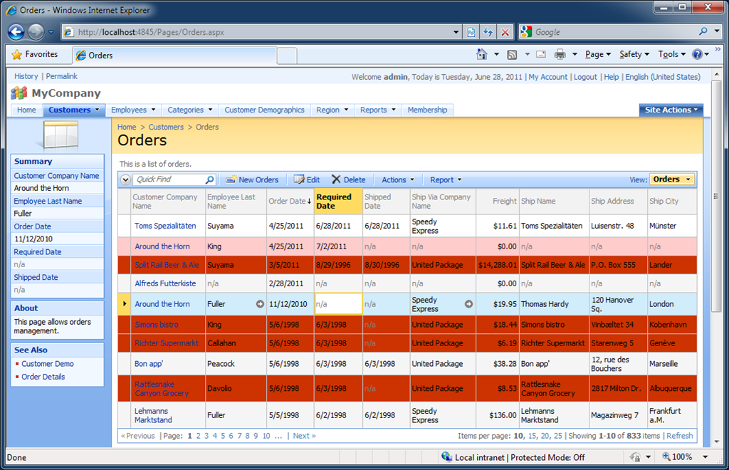 The screenshot below shows a list of orders from the Nortwhind database sample presented in a Data Sheet view. Conditional styling rules are applied to the view.