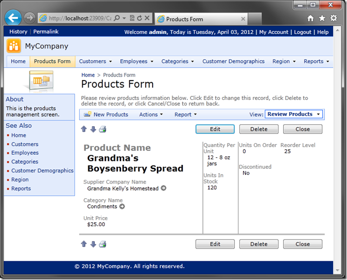 Save this file and run the web application. Navigate to the Products Form, and select a product. You will see the fields are displayed in a vertical list with the labels above the data, instead of being on the left.