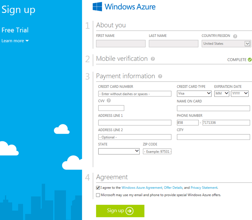 Once logged in, you will be required to confirm details of your account. Verify your mobile number, and enter valid payment information, agree to the terms, and press Sign up. Don’t worry, Microsoft will not charge you, as you will be assigned a default Spending Limit of $0.00, as outlined at https://www.windowsazure.com/en-us/pricing/spending-limits/.