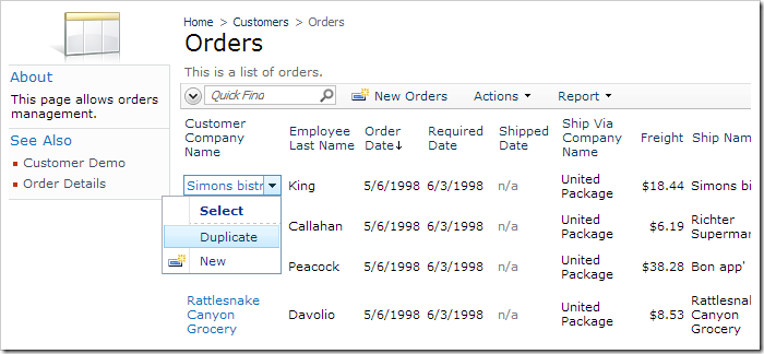 For example, suppose that the web application described in the When Client Script tutorial has been created. The three Edit actions in the Orders controller are not displayed when the Status field of the order is set to “Committed”.