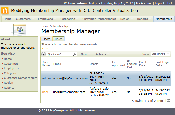 Code On Time web applications designed for Internet access have an option to include a built-in Membership Manager. This tool works on top of Microsoft ASP.NET Membership to simplify user and role management in generated apps. It uses exactly the same data controller architecture as the rest of data controllers in a project.
