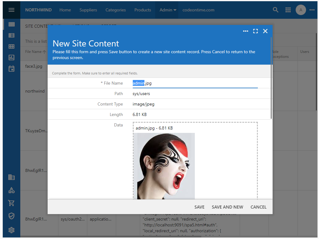 Applications created with Code On Time have the built-in Content Management System (CMS) that allows persisting the app-specific data at runtime. The single table named SiteContent acts as a file system for the app. The FileName and Path columns describe the virtual file location. The data is stored either in the Text column or in the binary Data column. The ContentType provides the MIME type information explaining the purpose of the data.