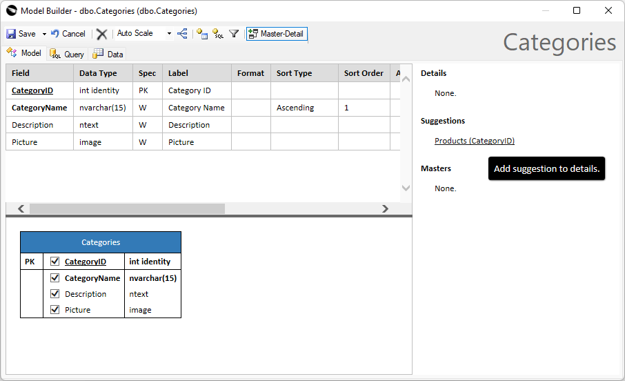 Toggle the Master-Detail button on the toolbar and click on the Products (CategoryID) suggestion in the panel on the right-hand side of the screen. This will create the Products detail in the model.