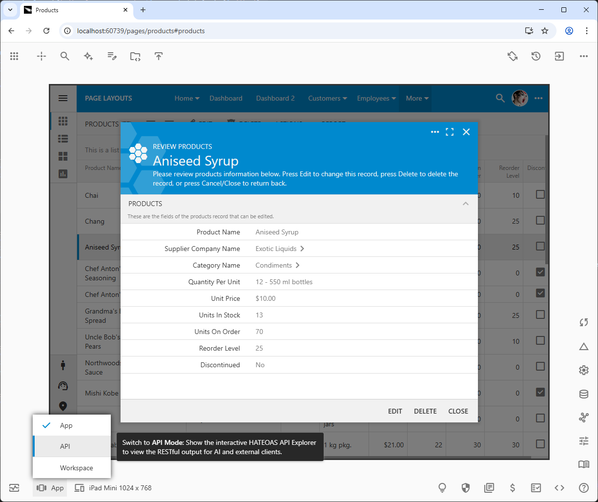 - HATEOAS API: Automatically generates a Level 3 RESTful API that mirrors your UI.