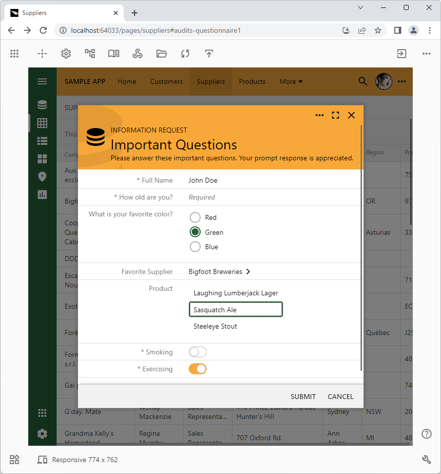 Application framework enhanced with the Surveys Add-on will display the progress button for the Audits.Response data field at runtime, when an audit record is shown in the Audit form. The button text will show the progress of the audit. The survey form will be displayed with the previously collected data when the button is pressed. The collected values are persisted as the value of the field marked as input-survey-data when the form is saved.