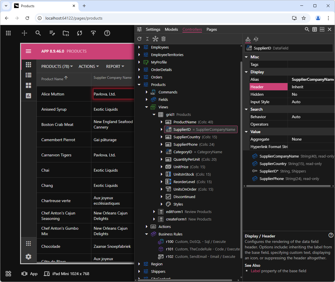 The provided screenshot displays the App Explorer following a live inspection of a value in the "Supplier Company Name" column. The image shows the attached hierarchy and properties side-by-side, with the "Header" property of the "SupplierID" data field selected. A brief description explains the property's purpose. Tabs within the title grant quick access to "Settings", "Models", "Controllers", and "Pages". The right side of the title contains buttons for "Search", "Display Hierarchy as Table", "Split Vertically", and "Close".
