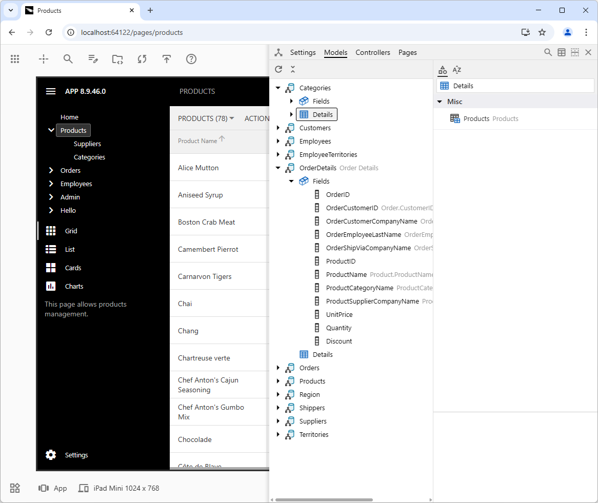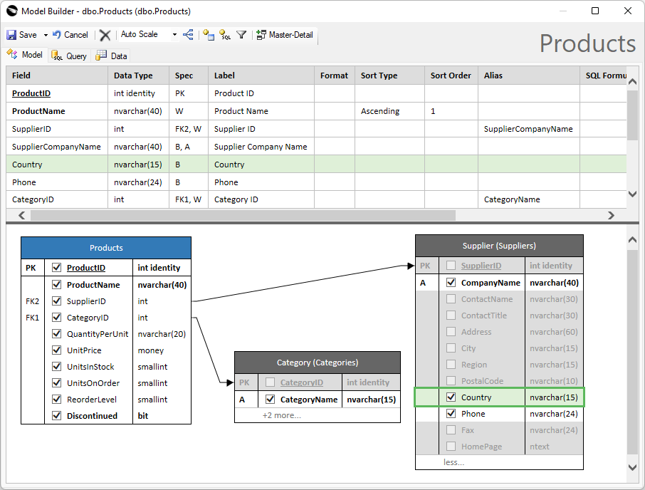 The modernized Model Builder in App Studio will be familiar to experienced Code On Time users, as it closely resembles the legacy model builder, shown here with the Products data model. The "Design" option within the App Explorer node will open a nearly identical view of this model. A key difference is that the Query and Data tabs, along with the toolbar, are being reimplemented in JavaScript, whereas the legacy tool used WinForms components.