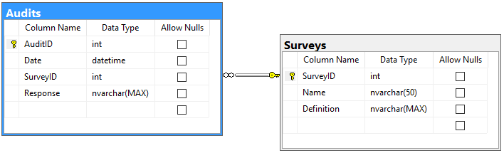 Consider the following database schema that may become a foundation of an auditing or inspection system. The catalog of survey forms is stored in the Surveys table. The definition of a survey is persisted in the JSON format to the Surveys.Definition column.