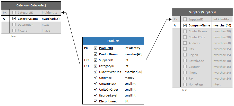 The schema management in the Database Builder tool (embedded in the App Studio) will be based on the database diagramming of the Model Builder. The image shows the Products data model in the schema section of the Model Builder.