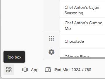 The “Toolbox" button, located in the bottom left corner, activates the Toolbox panel. This panel provides access to Components that facilitate both the creation and transformation of user interface elements within the live UI (displayed in the 'inspection frame') or through the App Explorer. Developers can also activate the Toolbox panel by holding the Ctrl key while performing live inspection.