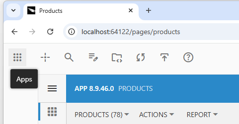 Functionality for the "Apps" button in the top corner will be included in release 8.9.48.0. When selected, the button will display the hierarchy of apps on the developer's workstation. The apps will be organized into groups. Clicking on the project name will take the user to the live instance of the app, with the option to start the application in "Edit" mode.